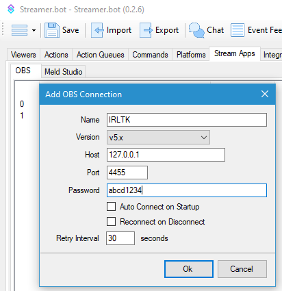 Add an OBS Connection to Streamer.bot, use the Host URL and password found on your irl.run dashboard's System settings.